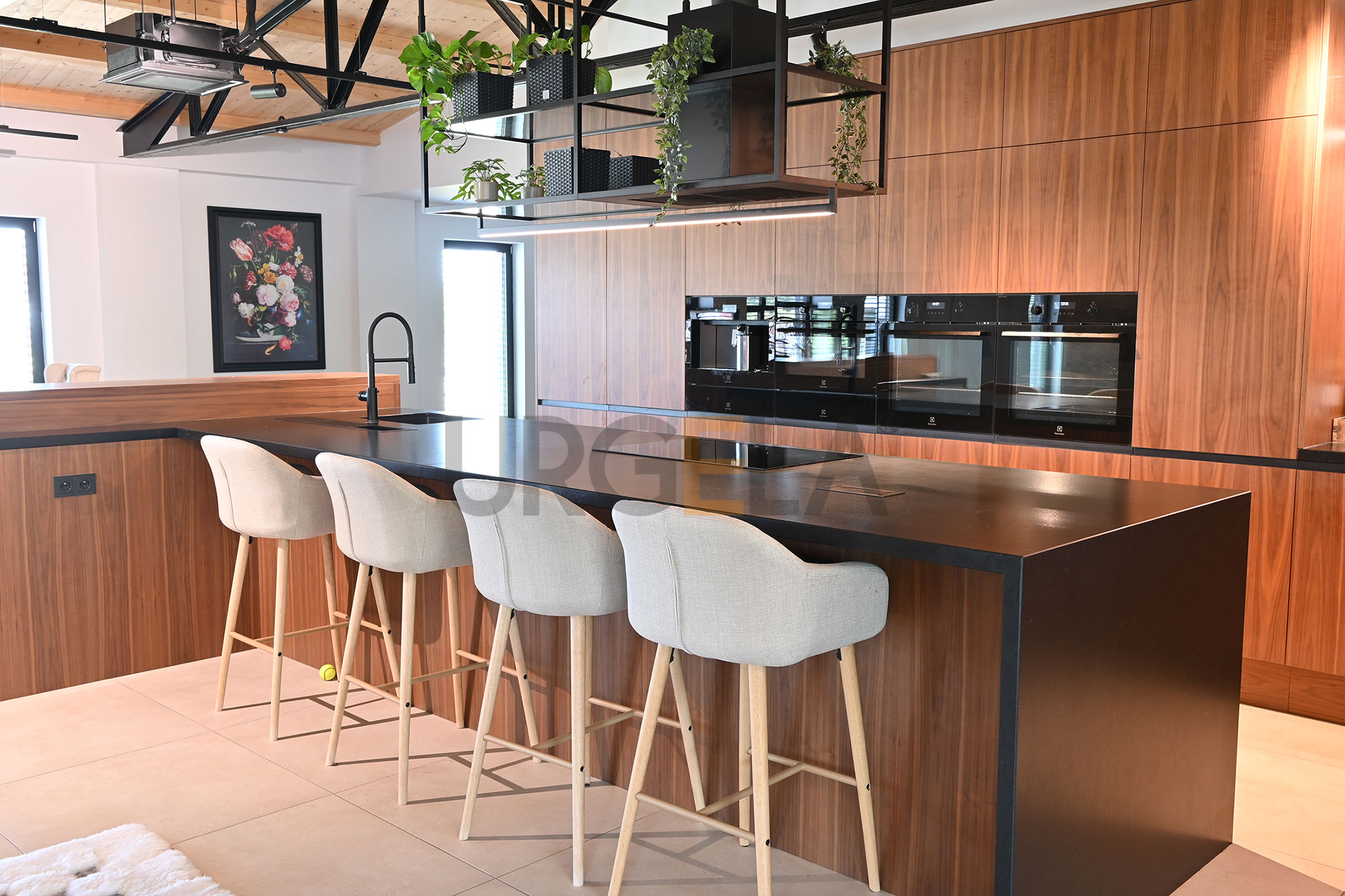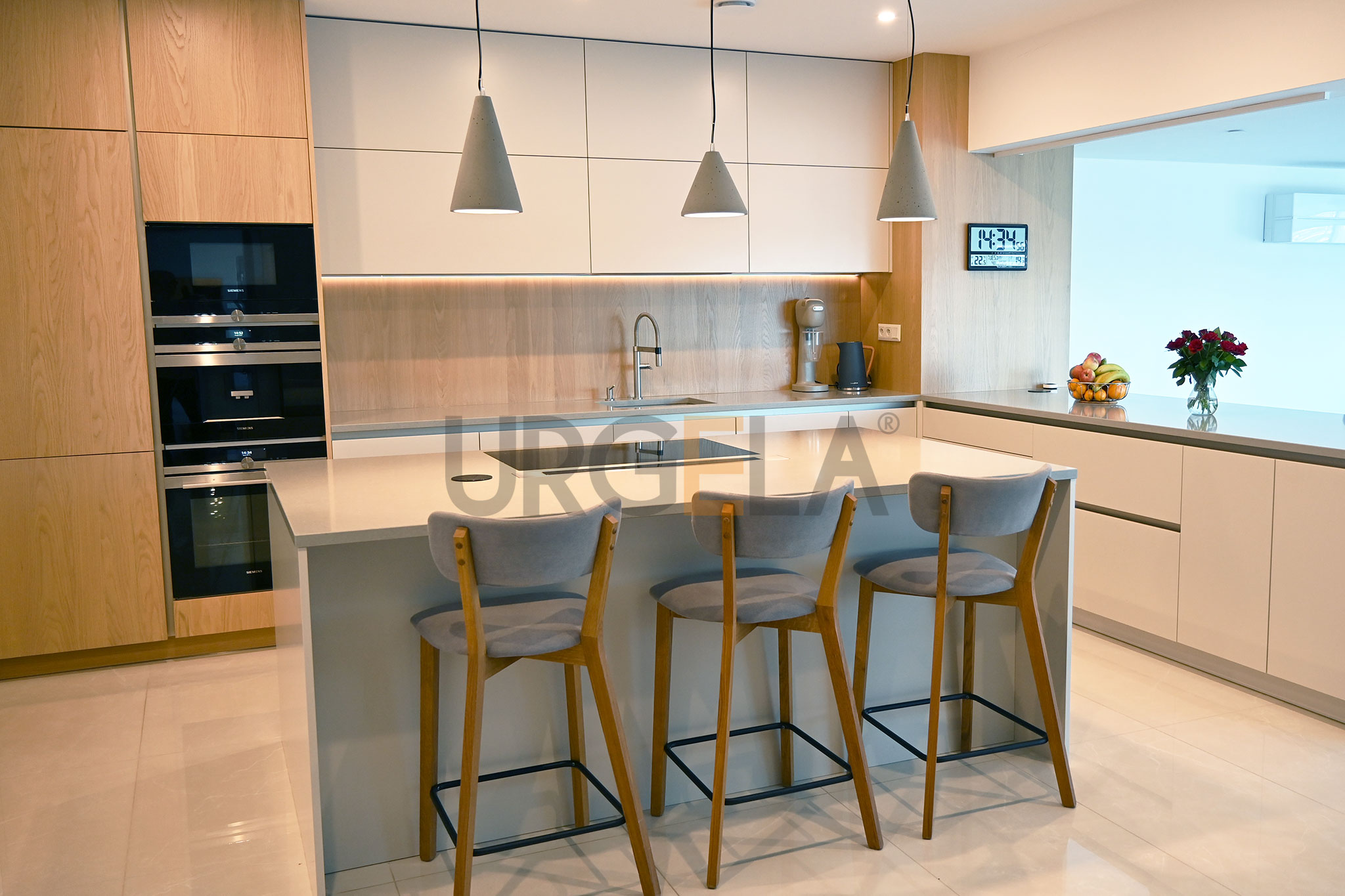Apartment in the new Karpatium residence building furnished with furniture in a uniform style throughout the apartment. Natural champagne gloss colors and natural oak veneer were used.