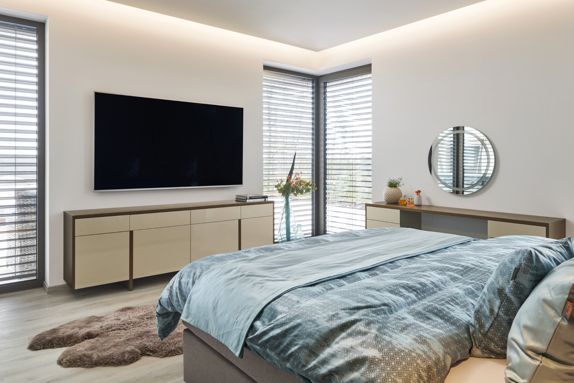 zavesená na stene odľahčuje celkovú kompozíciu interiéru. Otvorená nika zase veľmi vkusne korešponduje s policami na bočnej stene.
