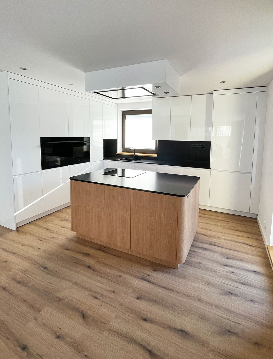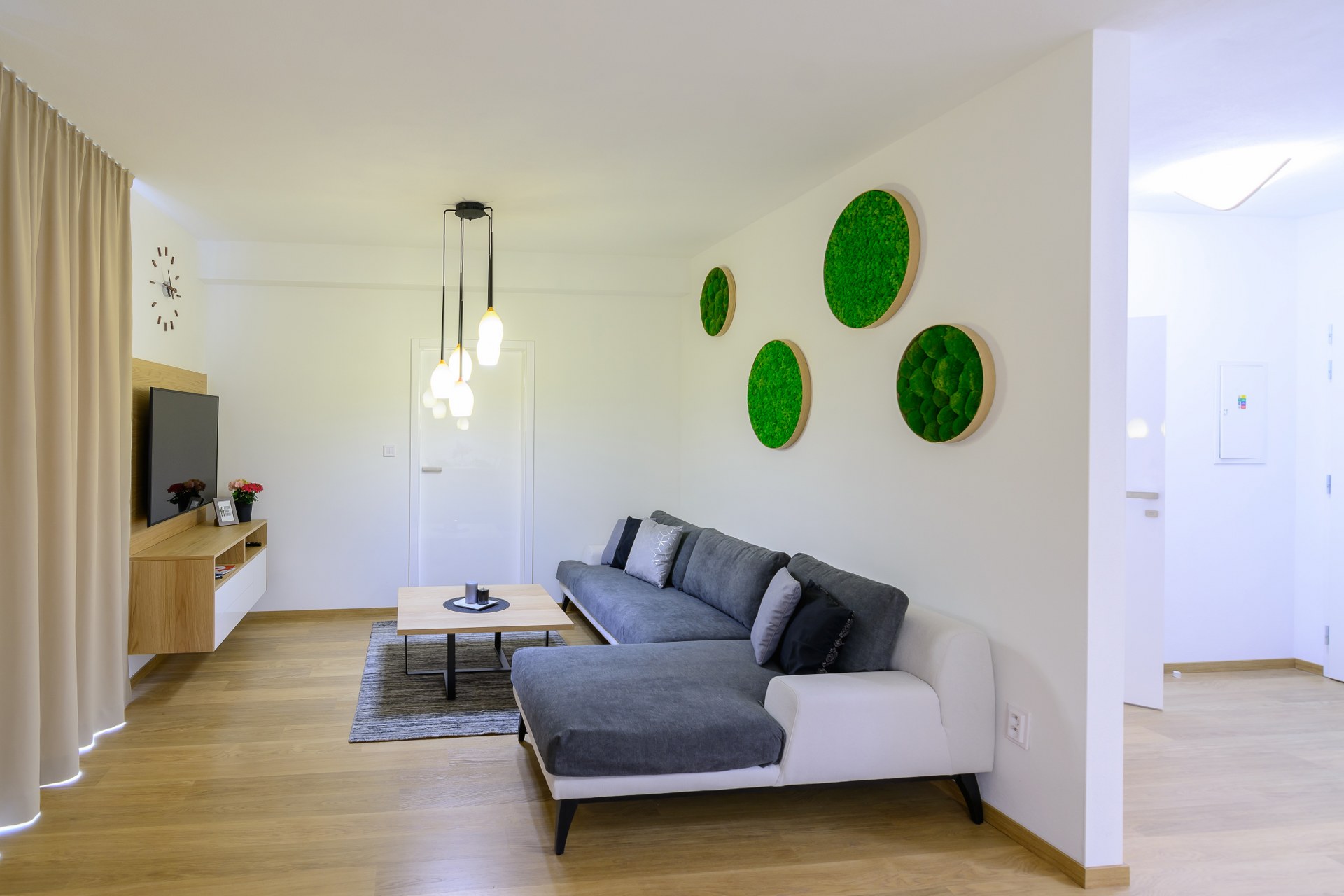 Kuchyňa a obývacia izba v trojkombinácii materiálov