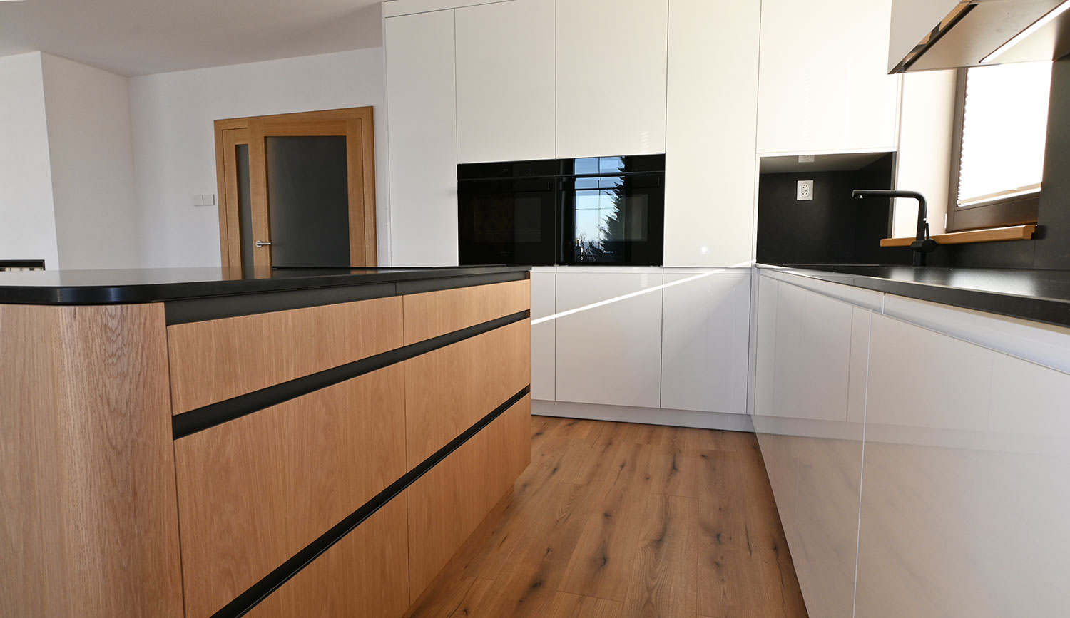 Krásny oblý drevený ostrov dodáva tejto kuchyni unikátny ráz. Nadčasové riešenie kuchyne na mieru do domu s čiernou kamennou pracovnou doskou.