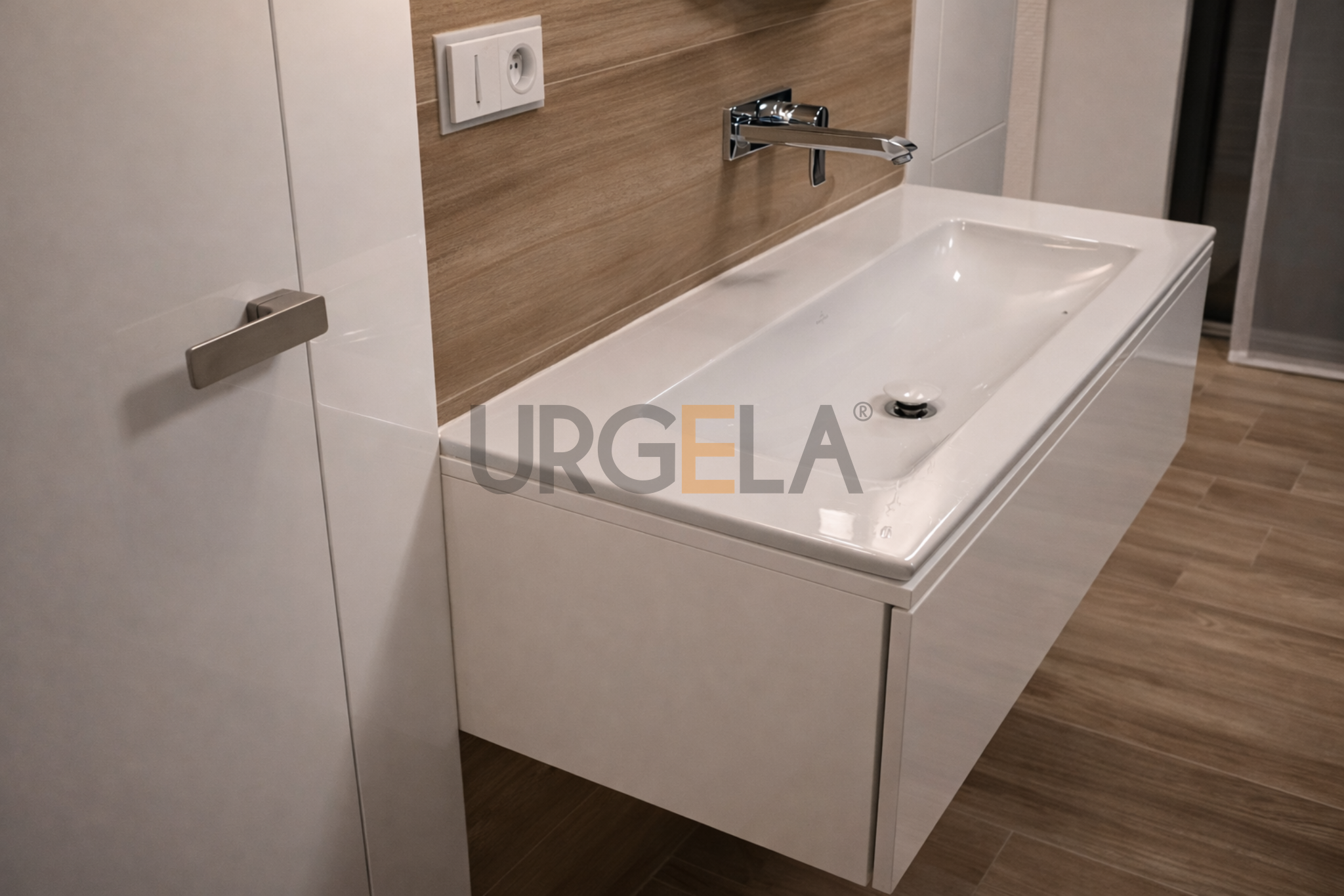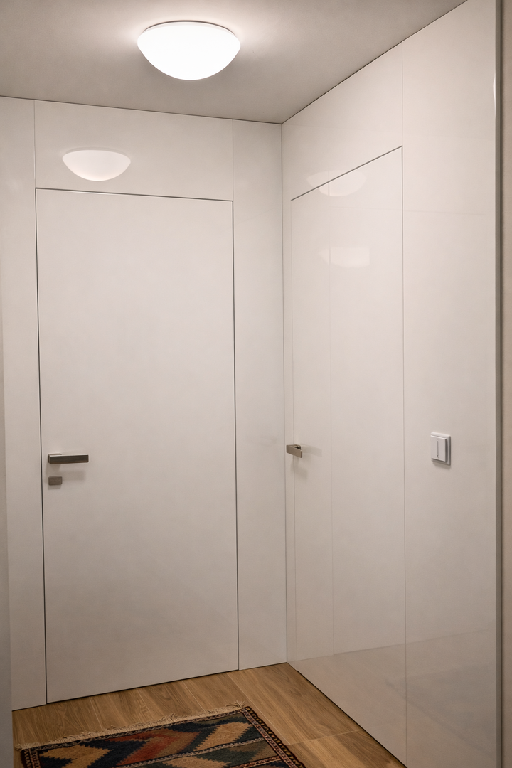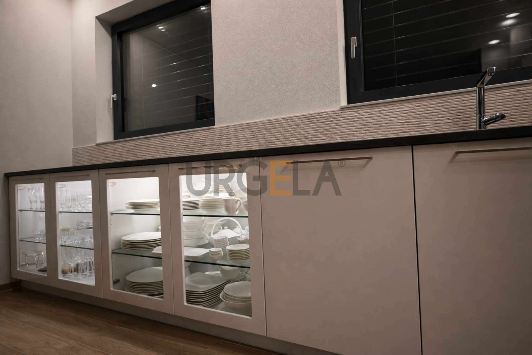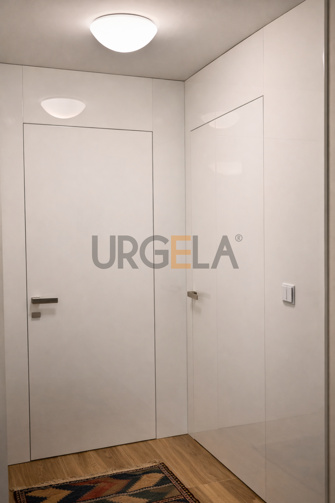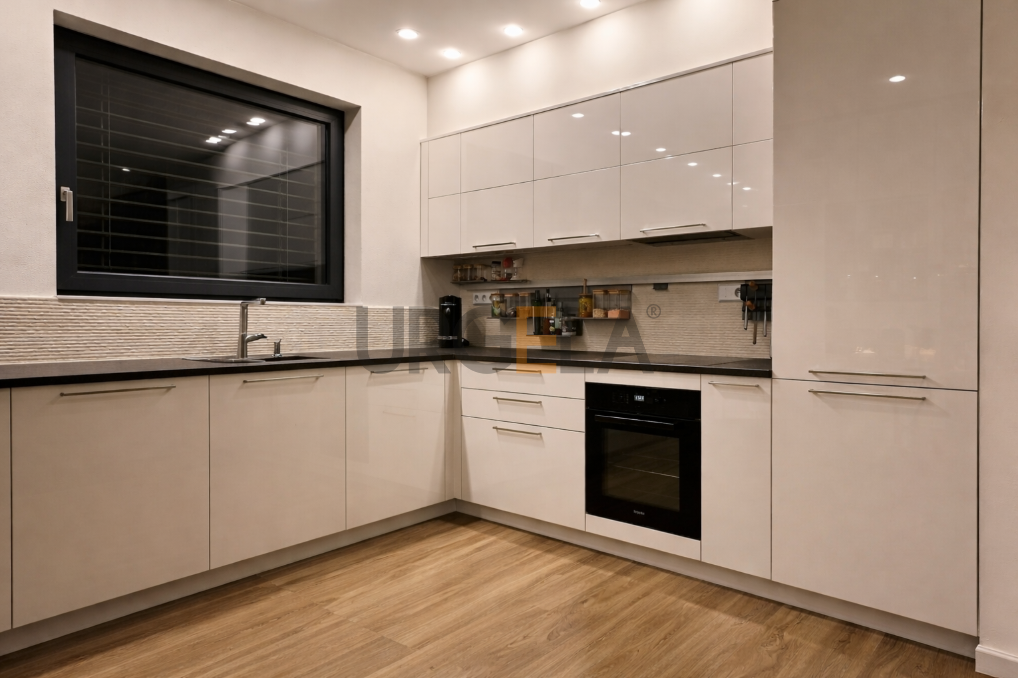 Biela lakovaná kuchyňa na mieru s tmavou kamennou pracovnou doskou. Zaujímavé a nadčasové riešenie veľkej kuchyne na mieru. Biely 7-vrstvový lak a tmavý kameň vytvárajú pekný kontrast. Ukážka praktických úložných systémov nábytku na mieru v kuchyni. Presklené dvierka spodných skriniek vyrobené presne podľa požiadaviek klienta. Samozrejme, nasvietené moderným LED osvetlením. Minimalistické riešenie nábytku na mieru pokračuje aj do priestrannej vzdušenej kúpeľne. Sú tu aj biele lakované interiérové dvere, ktoré dopĺňajú jednotný dizajn nábytku v interiéri. V interiéri nesmú chýbať kvalitné interiérové dvere na mieru.