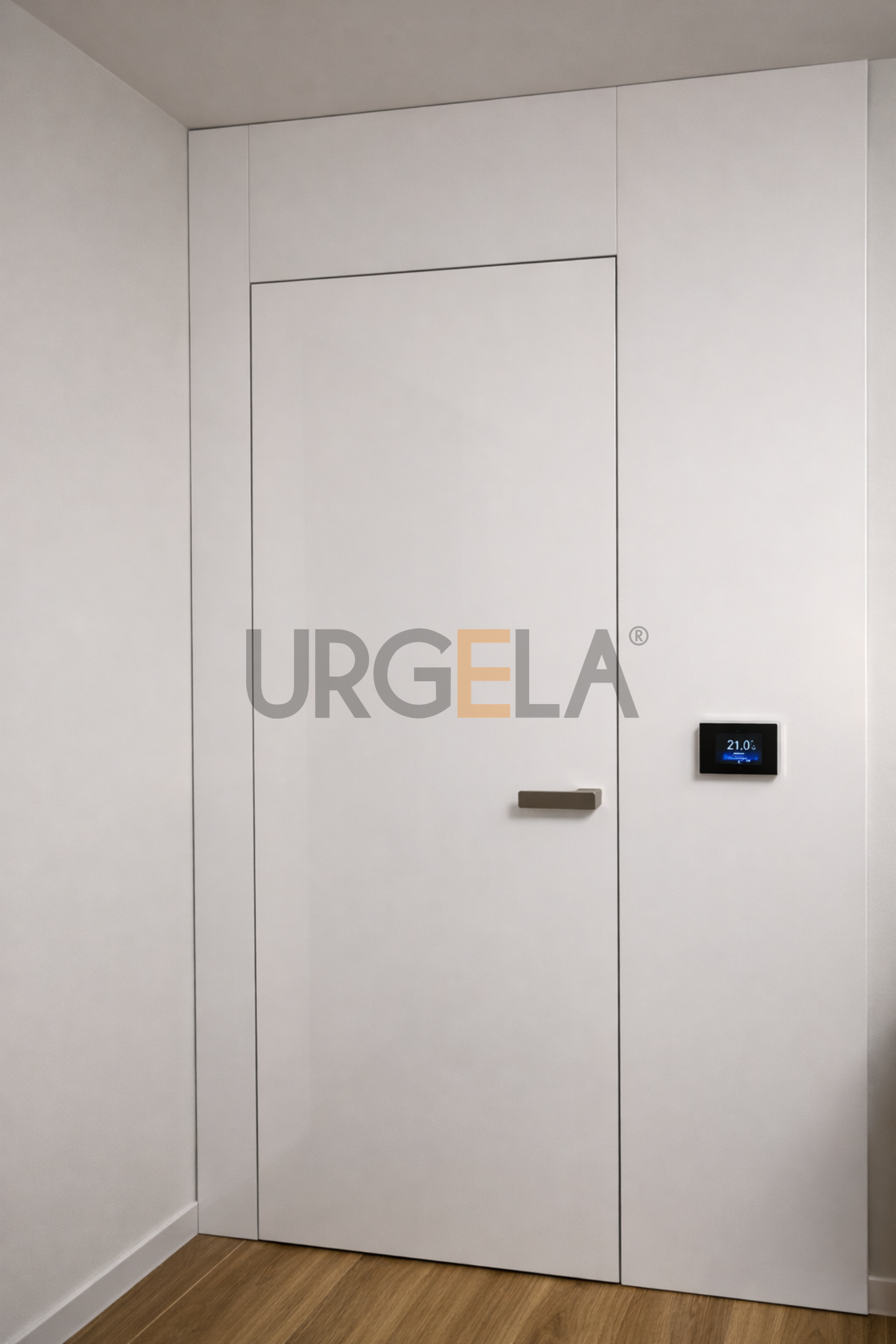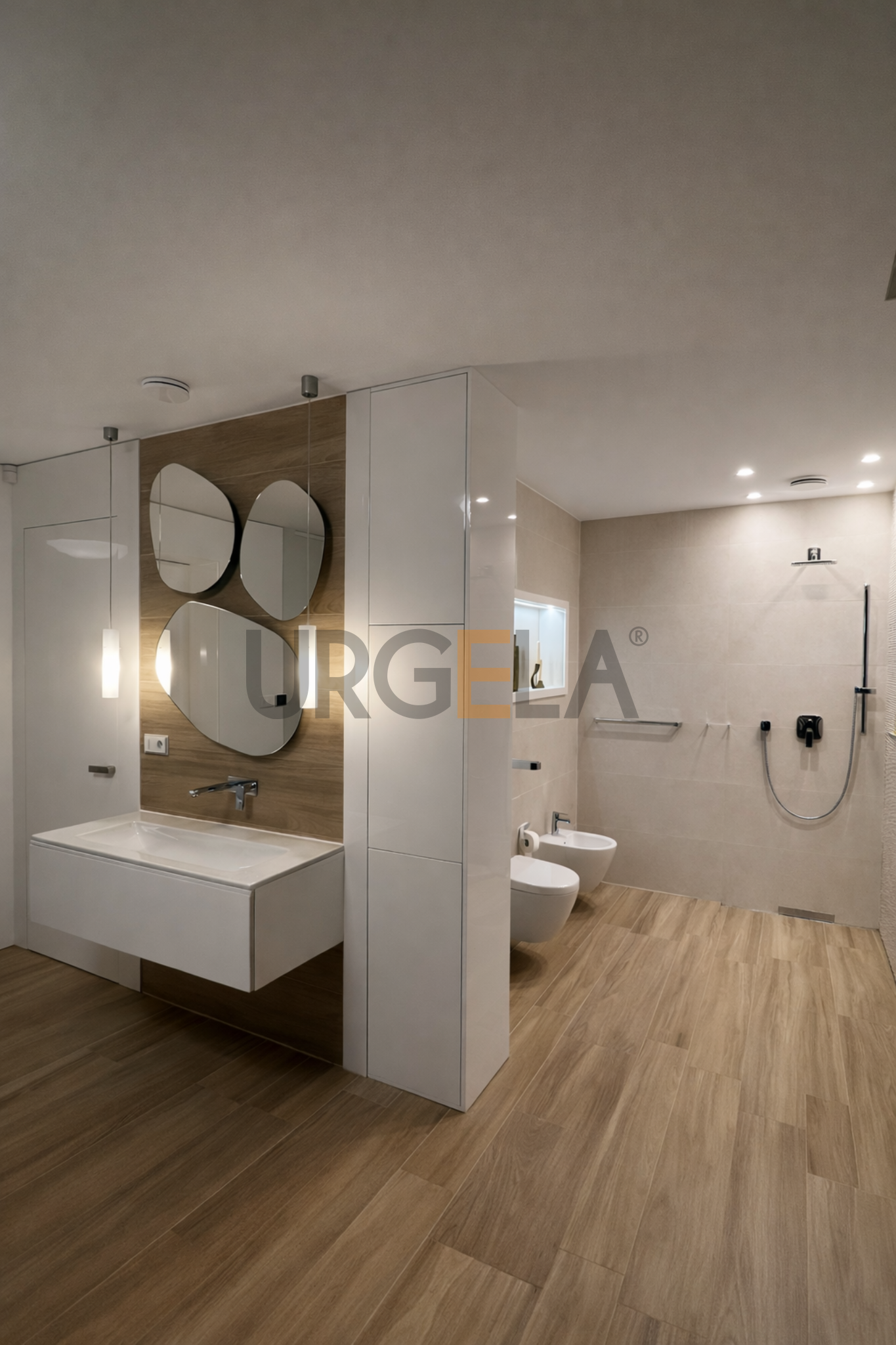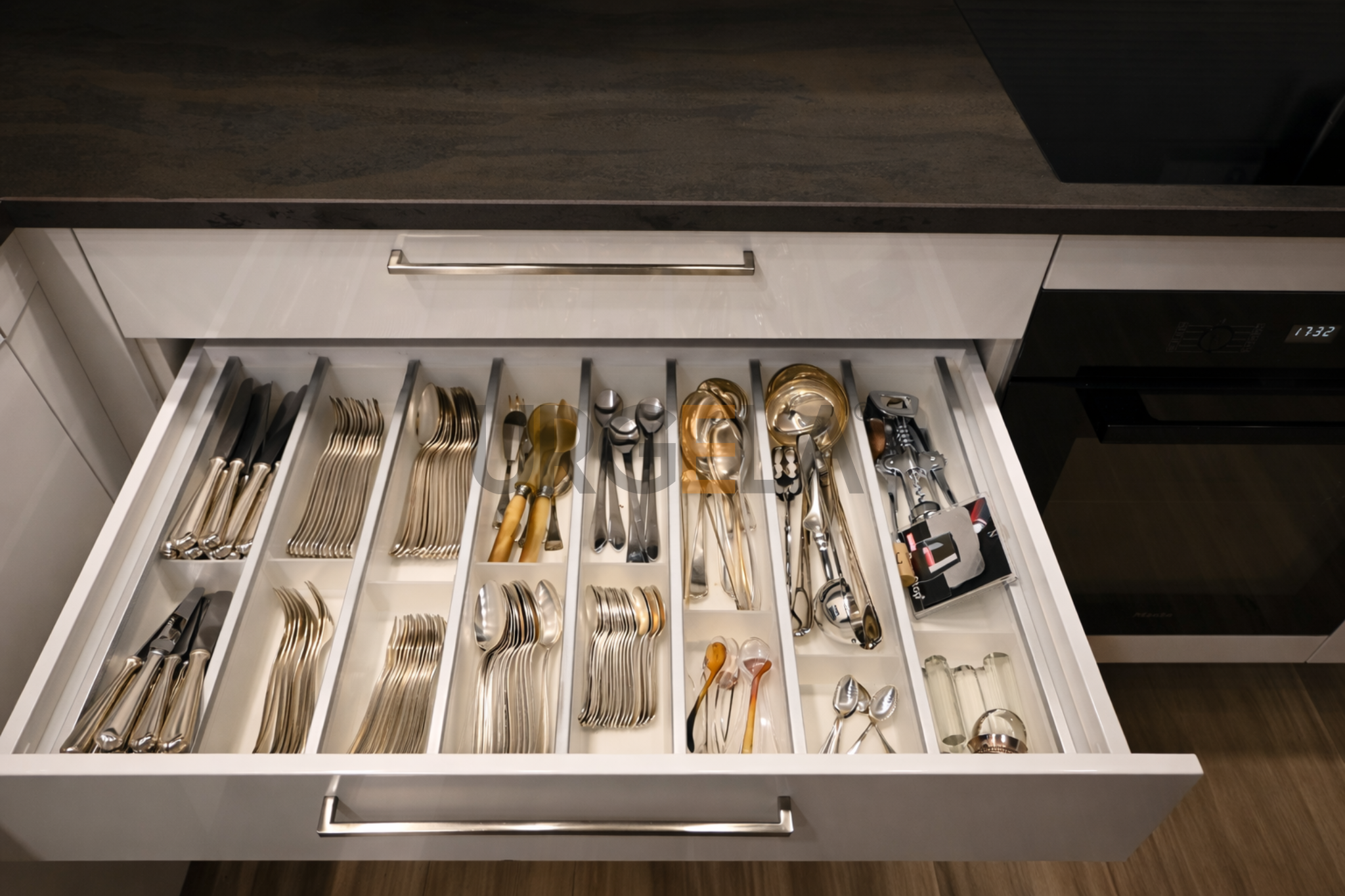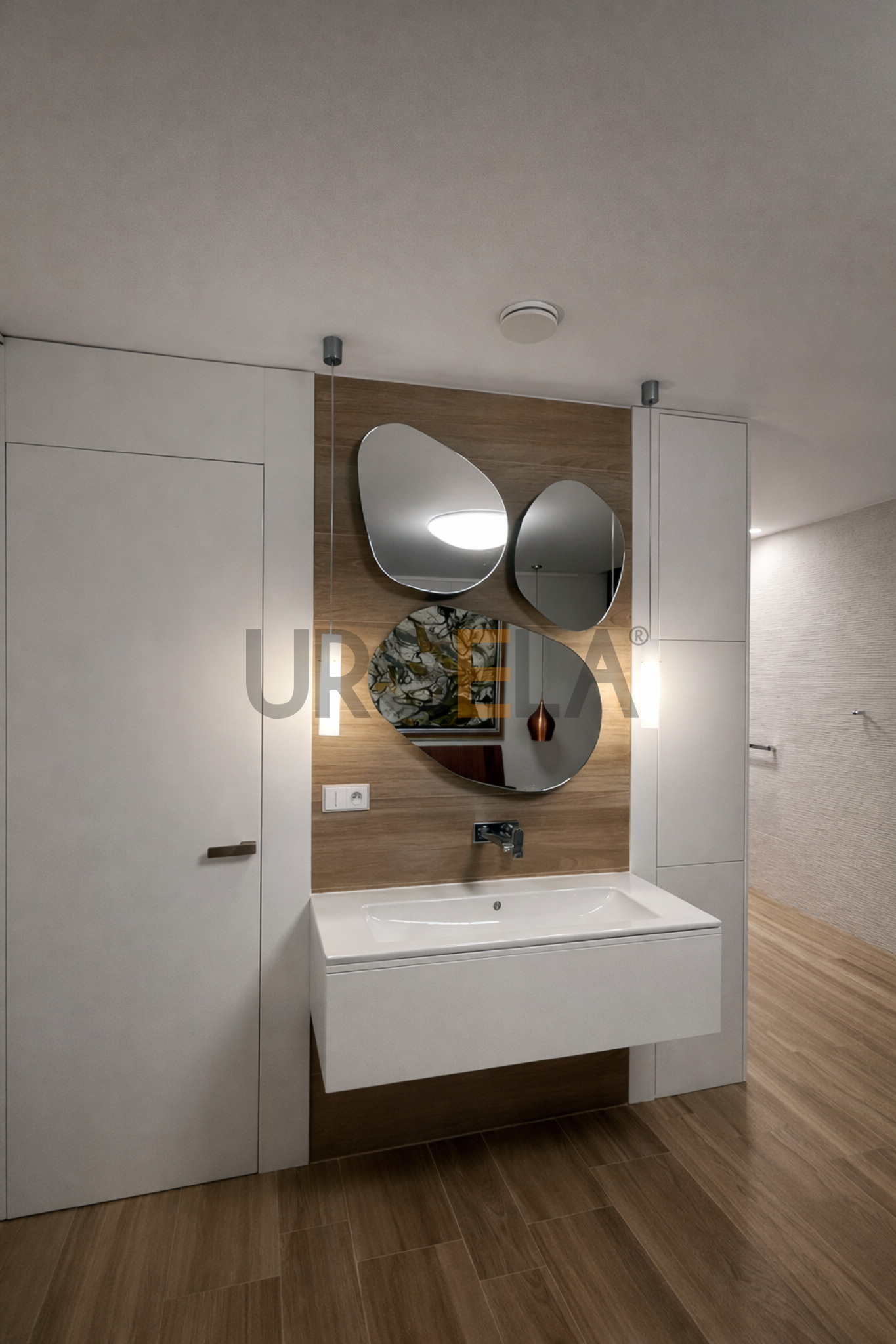 Biela lakovaná kuchyňa na mieru s tmavou kamennou pracovnou doskou. Zaujímavé a nadčasové riešenie veľkej kuchyne na mieru. Biely 7-vrstvový lak a tmavý kameň vytvárajú pekný kontrast. Ukážka praktických úložných systémov nábytku na mieru v kuchyni. Presklené dvierka spodných skriniek vyrobené presne podľa požiadaviek klienta. Samozrejme, nasvietené moderným LED osvetlením. Minimalistické riešenie nábytku na mieru pokračuje aj do priestrannej vzdušenej kúpeľne. Sú tu aj biele lakované interiérové dvere, ktoré dopĺňajú jednotný dizajn nábytku v interiéri. V interiéri nesmú chýbať kvalitné interiérové dvere na mieru.