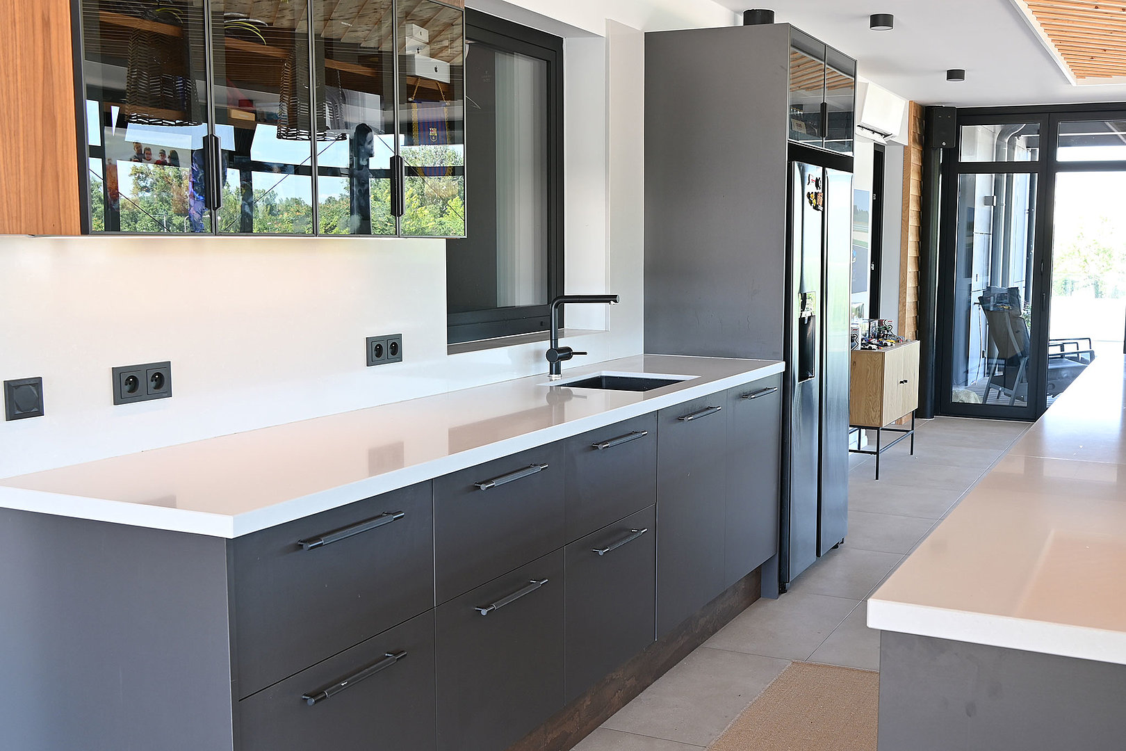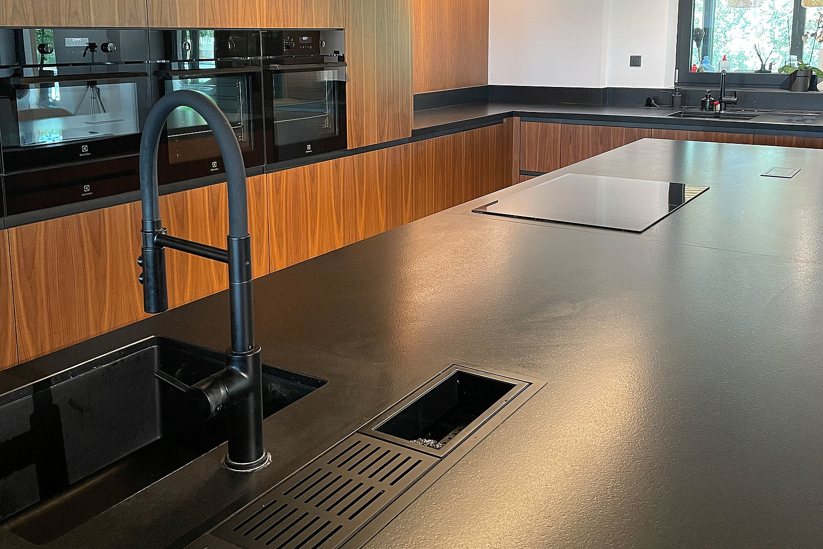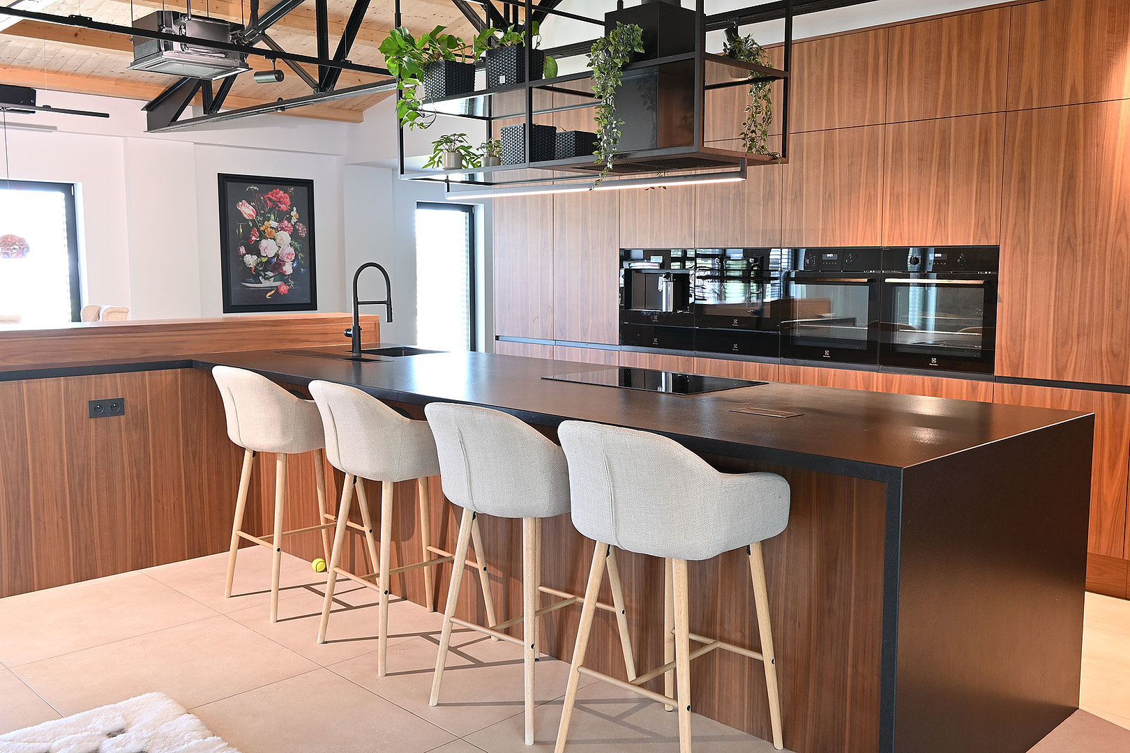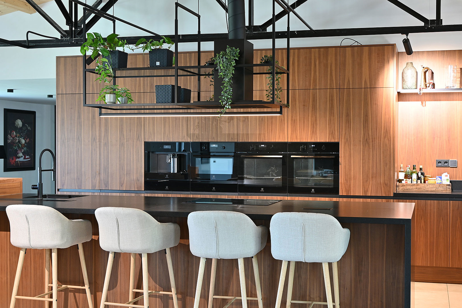 Veľký rodinný dom s vysokými stropmi a unikátnym interiérom. Priestranná kuchyňa na mieru. Výrazná orechová dýha zdobí veľkú miestnosť, ktorá je dokonale zladená. Mnohé praktické riešenia v kuchyni priam volajú, aby sa tu už hneď začalo variť. Ostrovný digestor model OFIUCO je dominantným prvkom celého priestoru kuchyne. Luxusný dojem dotvárajú čierne prvky a kombinácie materiálov, ako aj stropná čierna konštrukcia.